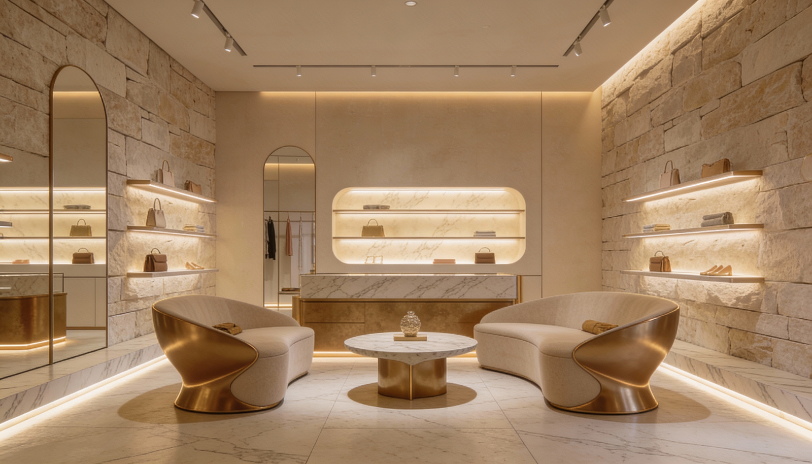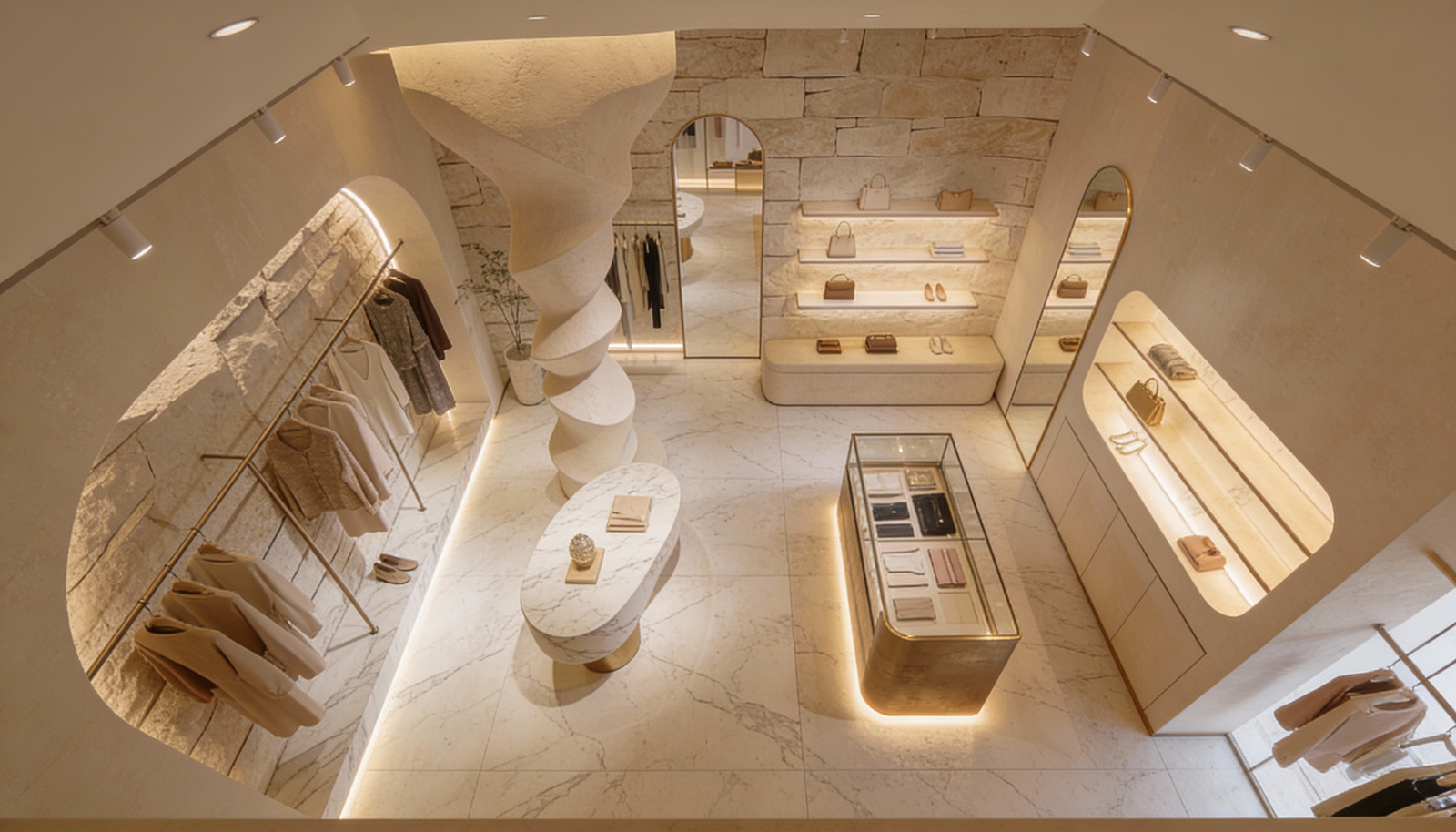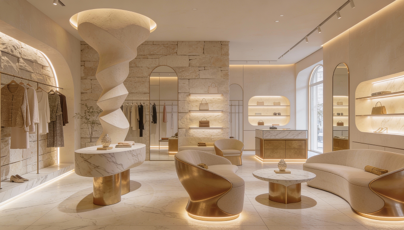 The warmth of stone walls meets the soft glow of concealed lighting. Brass accents frame archways like quiet invitations. Curved seating becomes a place to linger, not just to browse. And the sculptural centerpiece, a spiraling column of stone, doesn’t compete with the garments. It complements them, as if born from the same earth.