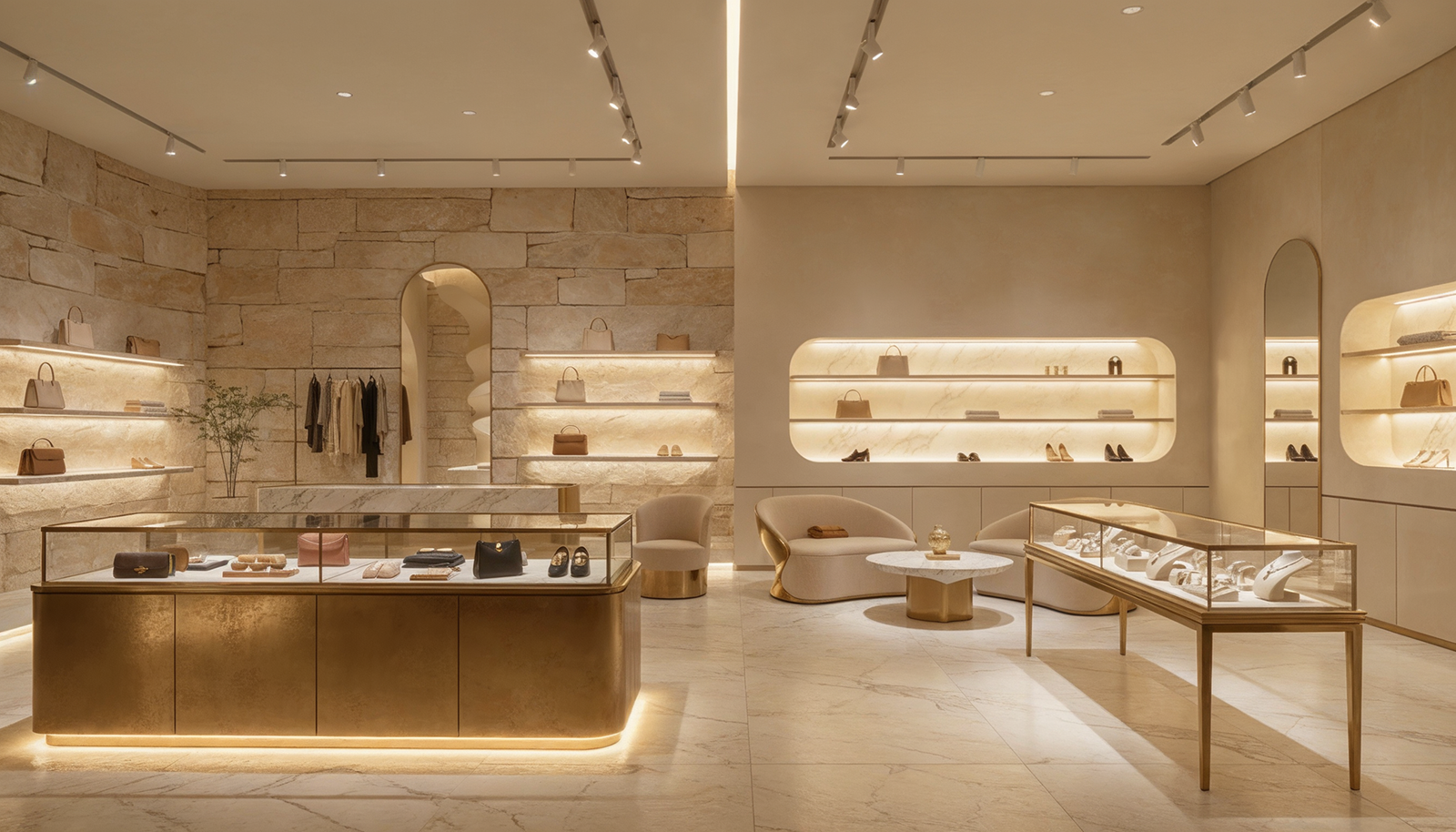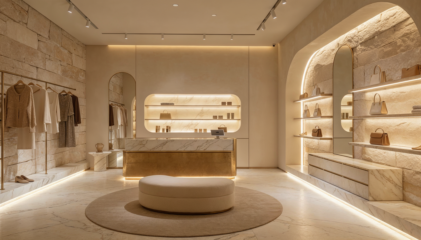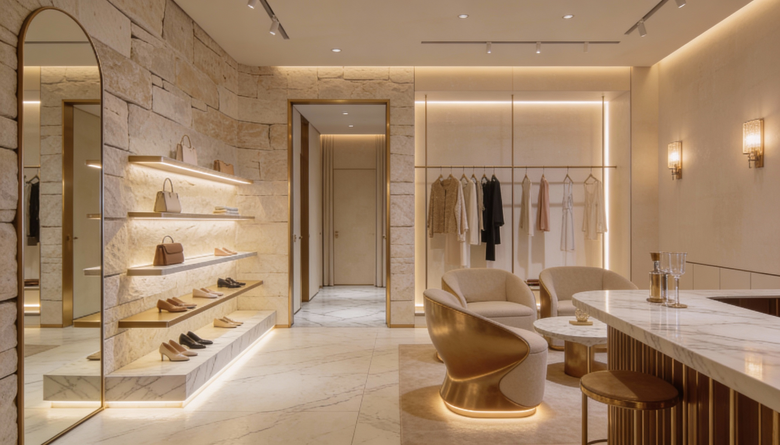The warmth of stone walls meets the soft glow of concealed lighting. Brass accents frame archways like quiet invitations. Curved seating becomes a place to linger, not just to browse. And the sculptural centerpiece, a spiraling column of stone, doesn’t compete with the garments. It complements them, as if born from the same earth.