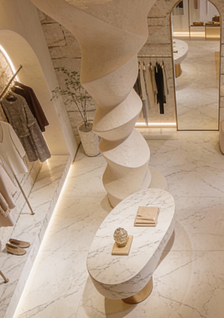 A space where clothing is not displayed but revealed. Where light guides the eye, texture invites the hand, and every curve feels deliberate.