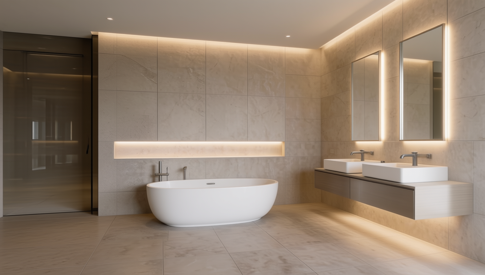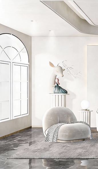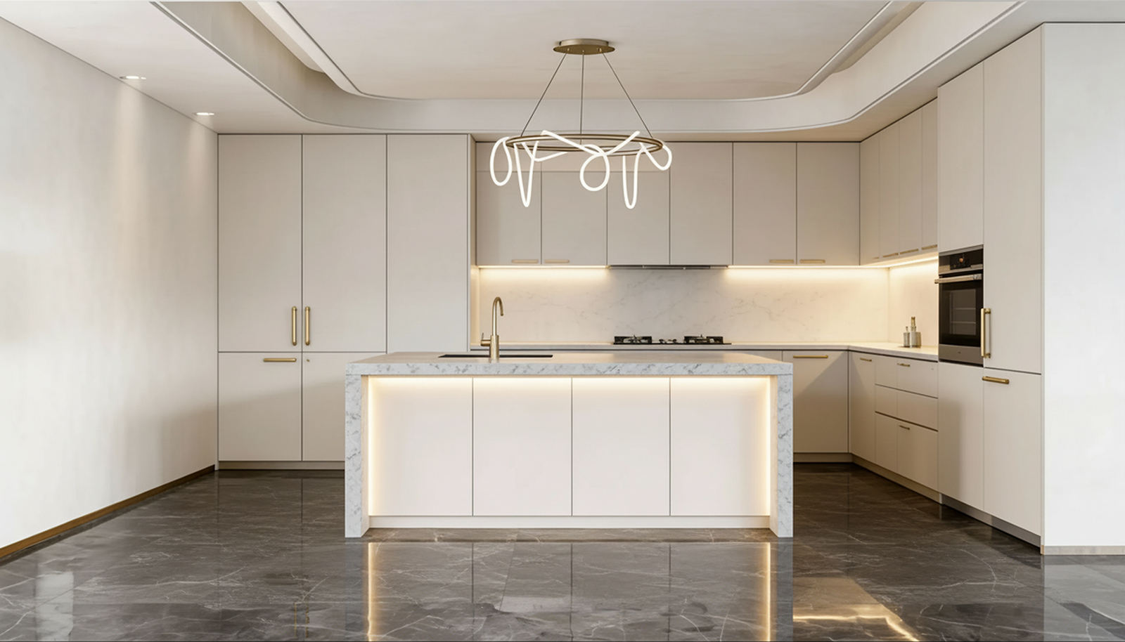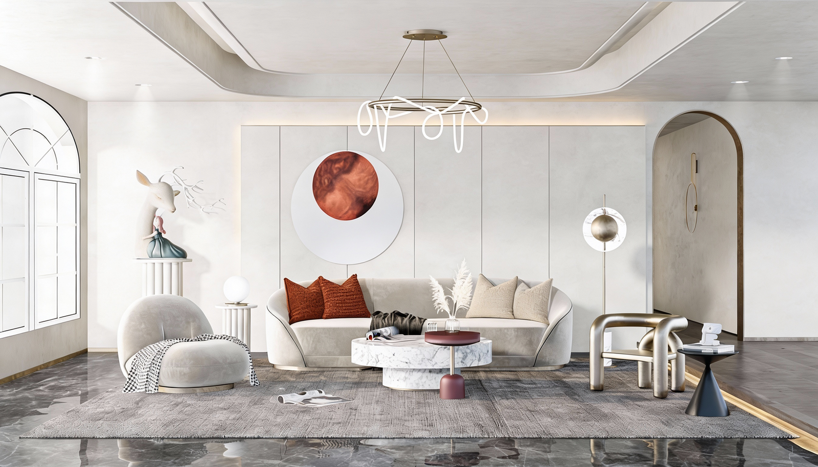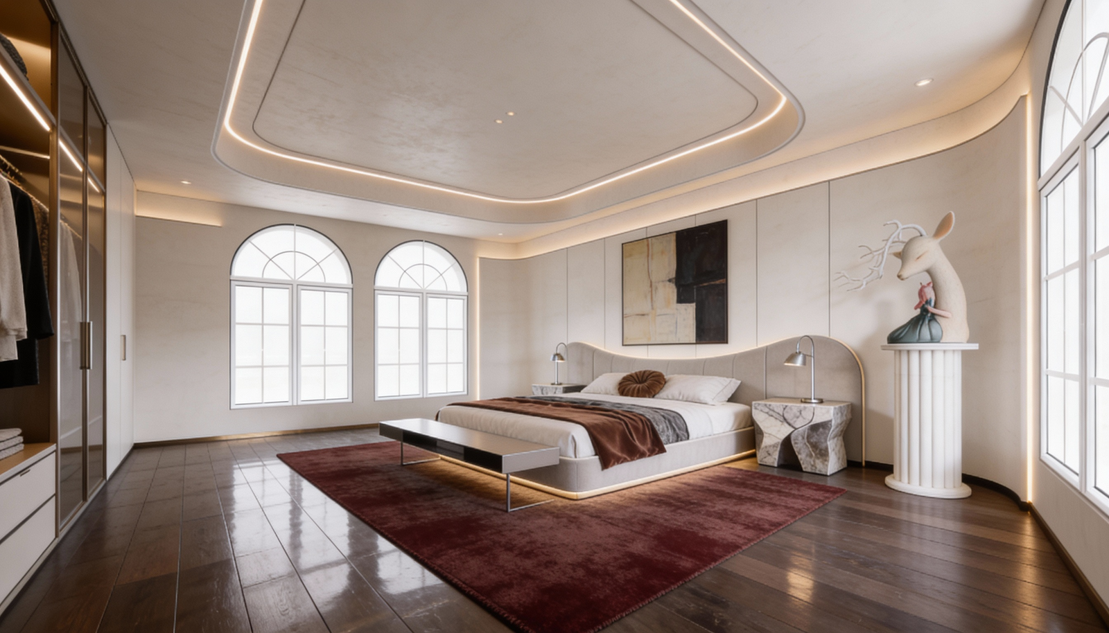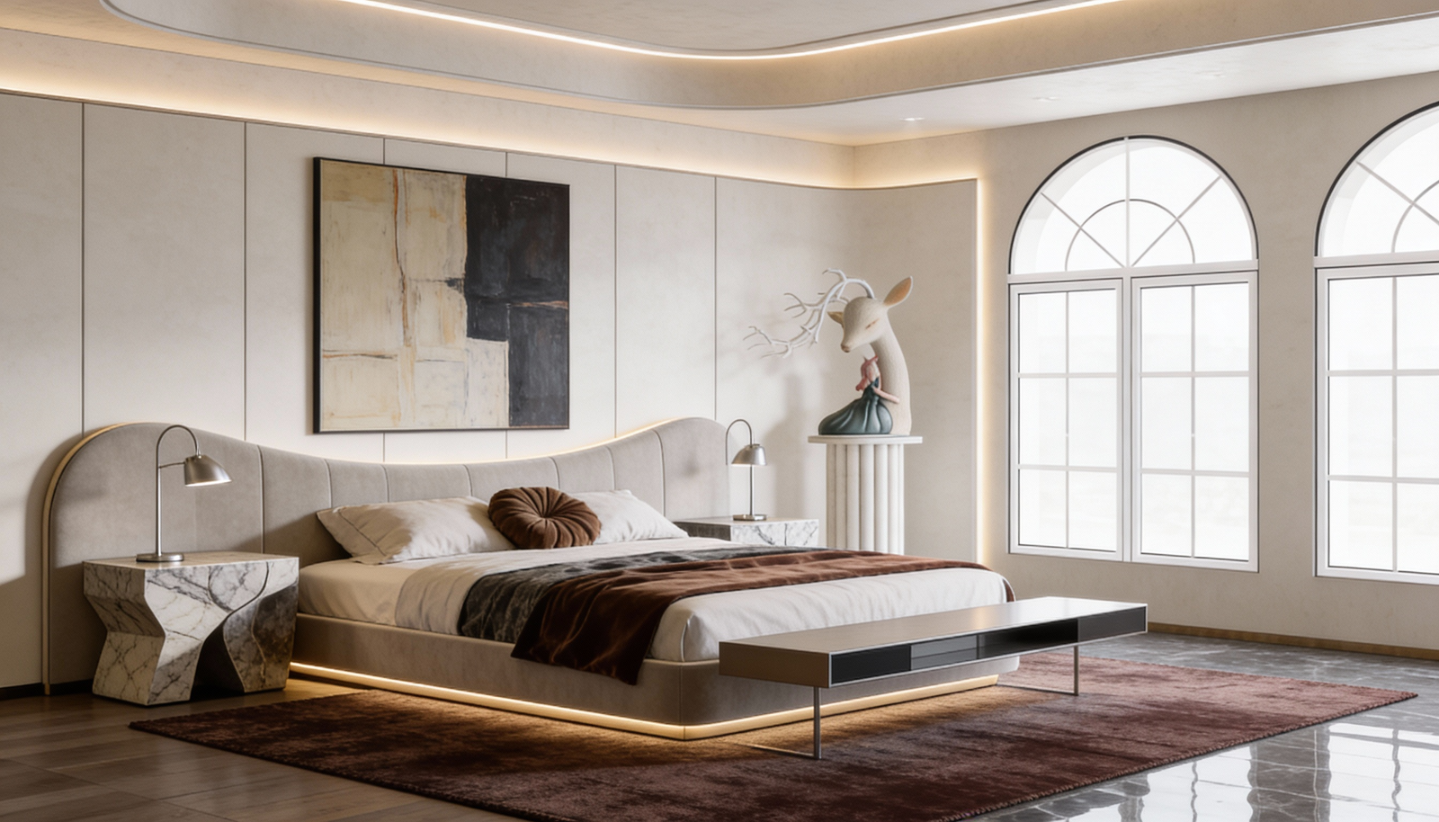 Sleek white cabinetry flows like sculpture. A sculpted chandelier floats above a curved sofa, while arched windows frame light like art. The bedroom glows with recessed ceiling curves and warm wood floors, anchored by a deep burgundy rug. The bathroom? A spa retreat with marble walls, floating vanities, and ambient lighting that feels alive.